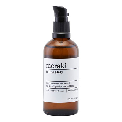 Self Tan Drops från Meraki har en innovativ formula designad specifikt för att ge dig en 100% skräddarsydd glöd. Den är bland annat baserad på aloe vera liksom havre- och gurkextrakt som är närande och fuktgivande för huden. Den fina färgen erhålls genom innehållet av dihydroxyaceton (DHA), som härrör från sockerbetor / sockerrör. Self Tan Drops är baserade på ekologiska ingredienser och kan användas var som helst på kroppen.