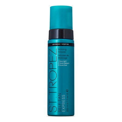 St. Tropez Self Tan Express Bronzing Mousse är en avancerad och prisbelönt 3-i-1 brun-utan-sol. Denna snabbtorkande mousse gör att du kan välja mellan en ljus, medium eller mörkbrun färg. Genom att applicera moussen med en handske kan du uppnå en solkysst lyster på bara en timme, en medelgyllene färg efter två timmar eller en djupt mörkbrun färg efter tre timmar.