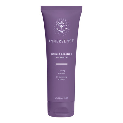 Innersense Bright Balance Hairbath är ett milt lila schampo för blonda och grå nyanser här i en liten flaska