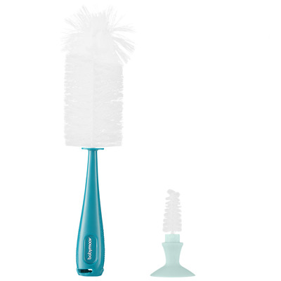 2-i-1 flaskborste från Babymoov har två borstar - en för drick- och nappflaskor och en för flasknappar. Flaskborsten rengör nappflaskan skonsamt och effektivt, helt utan att ge några repor eller liknande. Borsten gör det lätt att rengöra i alla veck och hörn, även i locket på nappflaskan. Den har även en sugkopp i botten som du kan fästa på köksbänken, så att den är redan redo nästa gång du behöver den.