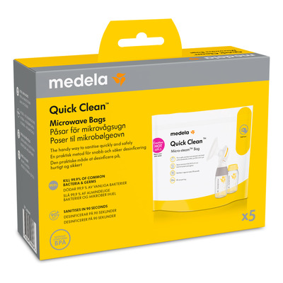 Placera det som ska rengöras i en Quick Clean påse och häll i lite vatten och placera den i mikrovågsugnen. Ångan rengör inuti Medelas Quick Clean-bag och dödar 99,9% av de flesta, skadliga bakterier och mikroorganismer, flaskor, nappar, flasktillbehör och brösttrattar blir helt rena och säkra att använda igen.