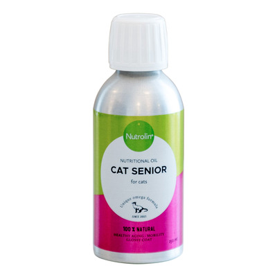 Nutrolin Cat Senior är ett kosttillskott för äldre katter baserat på fiskolja och solrosolja. Oljan innehåller omega-3-fettsyror som kan bidra till att bibehålla rörelseapparaten och stödja hjärt- och njurfunktionen. Tillsatt naturligt E-vitamin fungerar som antioxidant och skyddar de fleromättade fettsyrorna. Produkten har en mild smak och kan ges dagligen till äldre katter och äldre katter av alla raser.