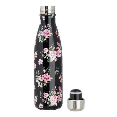 Vattenflaska i rostfritt stål, svart med blommor