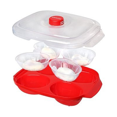 Med plats för fyra ägg åt gången är denna bricka ett effektivt sätt att tillaga pocherade ägg. Fyll helt enkelt brickan med vatten, knäck äggen i de fyra separata insatserna, sätt på locket och placera den i mikrovågsugnen. När äggen är färdiga gör de praktiska insatserna det enkelt att ta ut äggen ur brickan för servering.