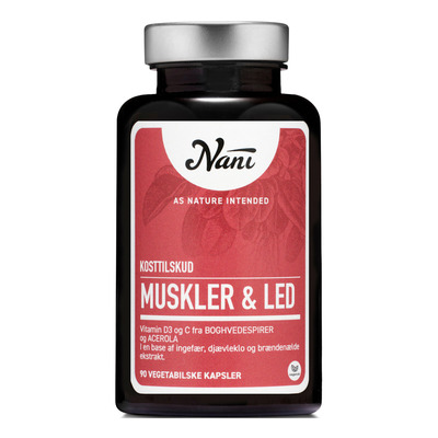 Nani's MUSKLER & LED är en fytoterapeutisk örtblandning bestående av djävulsklo, ingefära och nässla, och C-vitamin från naturliga källor (acerola), samt D-vitamin från bovetegroddar. D-vitamin från bovetegroddar ger samma absorberbara form av D-vitamin som bildas i huden när den utsätts för solljus, nämligen kolekalciferol. Nanis D-vitamintillskott är veganskt och innehåller fettsyra för bra upptag från bovetegroddarna, som förutom vitaminet också innehåller aminosyror, fibrer, fettsyror och många fler växtnäringsämnen. Produkten är berikad med vitaminer som bidrar till friskare leder och muskler.