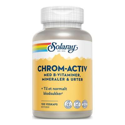 Chromay Active från Solaray är ett kapseltillskott baserat på en kombination av vitaminerna B3 och B8, krom, magnesium, mangan och zink samt kanel- och bockhornsfrö. Kapseln består av vegetabilisk hydroxipropylmetylcellulosa.