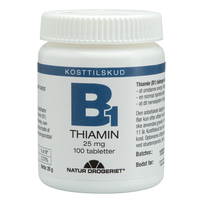 Kosttillskott från Natur-Drogeriet innehållande 100 tabletter fullproppade med vitamin B1. Vitamin B1 finns i livsmedel som fläskkött, jäst, kål, potatis och apelsiner, men om du inte får i dig tillräckligt genom din dagliga kost kan du med fördel ta ett tillskott. B-vitaminer utsöndras i allmänhet relativt snabbt från kroppen, vilket är anledningen till att du ofta behöver ett tillskott. Varje tablett ger dig 25 mg av det nyttiga vitaminet.