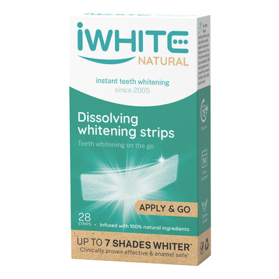 iWHITE Natural Strips är självupplösande strips som på ett säkert sätt bleker dina tänder var som helst, när som helst. Dessa revolutionerande strips är fyllda med 100% naturliga ingredienser som är skonsamma mot din emalj men tuffa mot fläckar. Applicera, lös upp och le! Tack vare iWHITE-tekniken kan du få upp till 7 nyanser vitare tänder.