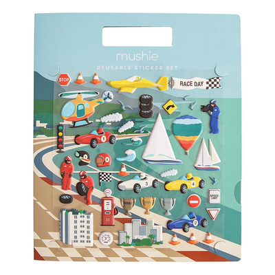 Mushie Reusable Sticker Set - Race Cars kombinerar lärande och lek för barn från 3 år och uppåt