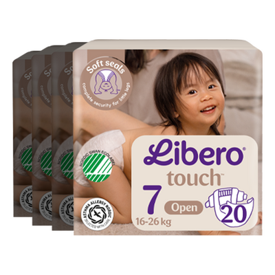 Libero Touch 7 Öppen blöja 16-26 kg är en mjuk, hudvänlig och andningsbar blöja med enastående läckagesäkerhet