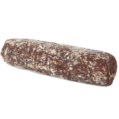 Denna ekologiska dadelrulle är gjord av hackade dadlar och dadelbitar rullade i mandelflarn. Dadelkärnor kan finnas i produkten.