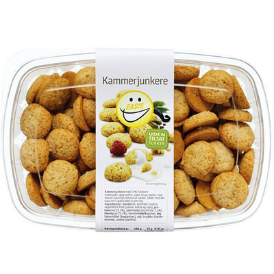 EASIS Kammerjunkere har inget tillsatt socker. Å andra sidan, innehåller de mycket fibrer och fullkorn, bl.a. fullkornsmjöl och havremjöl. De har en söt, kryddig smak av vanilj och kardemumma och så de är lite mindre än traditionella kammerjunkere. Prova spröda kammerjunkere på toppen av din favoritfilbunke..