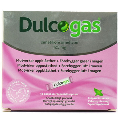 Dulcogas är ett medicinskt medel för lindring av uppblåsthet och förebyggande av luft i magsäcken. Används för att lindra magont orsakad av gaser i magen. För lindring och behandling av besvär i mag-tarmområdet genom uppblåsthet, tendenser att rapa, väderspänning, luft i magen, etc. och förtidig mättnadskänsla.