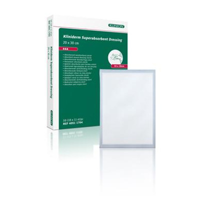 Kliniderm Superabsorberande förband kan absorbera små mängder blod, vilket minimerar risken för maceration av omgivande hud. Förbanden har en semipermeabelt, vätskeavvisande blå baksida och produkten innehåller inte några lim- eller bindemedel. Förbanden kan användas under kompression.
