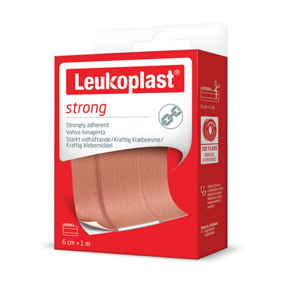 Denna variant av Strong från Leukoplast innehåller en plåsterrulle på 6 cm x 1 m, som du kan klippa till själv efter behov. Leukoplast Strong är ett robust plåster som har mycket bra vidhäftning och en absorberande sårkudde som effektivt täcker och skyddar såret från smuts och bakterier utan att fastna. Plåstret innehåller latex och har ett zinkoxidlim.
