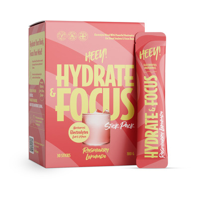 Heey! Hydrate & Focus Electrolytes innehåller även växtextrakt från igelkottsvamp, rosenrot och brahmi, som traditionellt används i kosttillskott. Varje låda innehåller 30 stycken 6g portionsstickor som är lätta att ta med sig och blanda med vatten. Drycken har en frisk smak av hallon och citron, är helt utan tillsatt socker, 100% vegansk och producerad i Sverige.